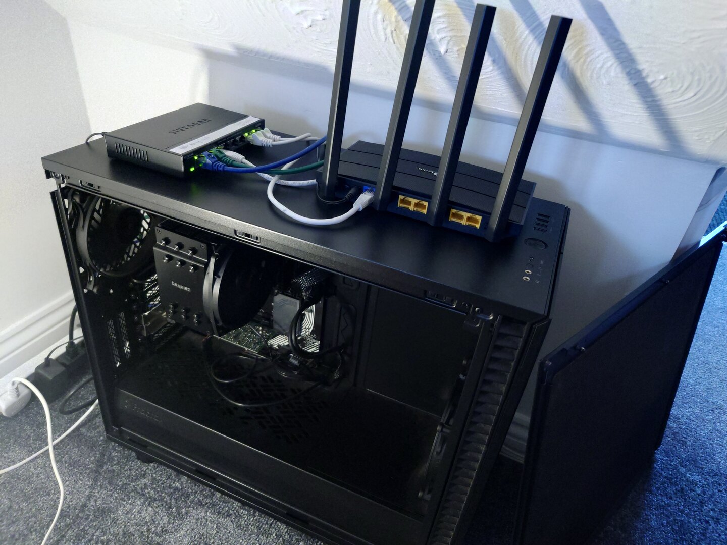 The most important VM I run is my OPNsense router. This is my internet gateway, DHCP server, DNS server and more. I run my router on here out of necessity. Previously I ran pfSense on the aforementioned Dell Mini PC, but I since got a gigabit internet connection, and the poor thing wasn’t able to route above about 300 Mbit/s. I could have bought a completely separate router that could handle the speeds but, being a cheapskate, I opted for a used quad Ethernet card instead.