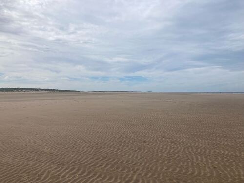 After the detour inland it was back out to sea and briefly back to sandy beaches. The beach at Holkham and onwards to Wells is one of the most beautiful in Norfolk. At low tide the sands seem endless. We walked partly out on the beach, looking for shells, and partly inland a bit in the woods when the sand became too tiring.