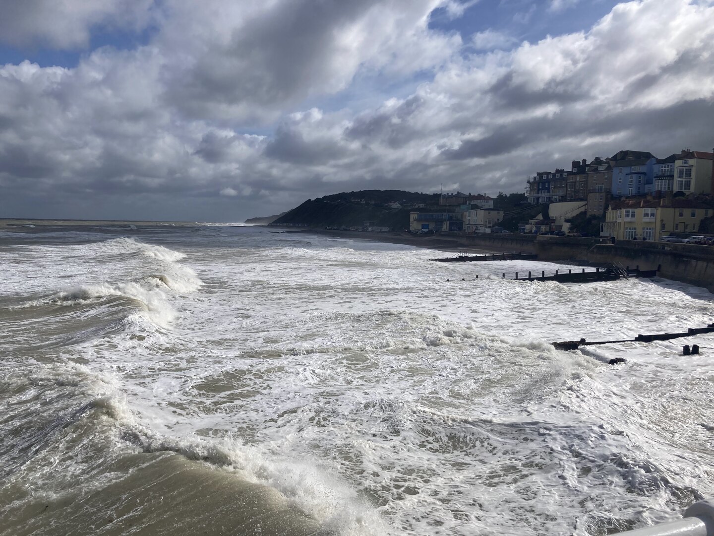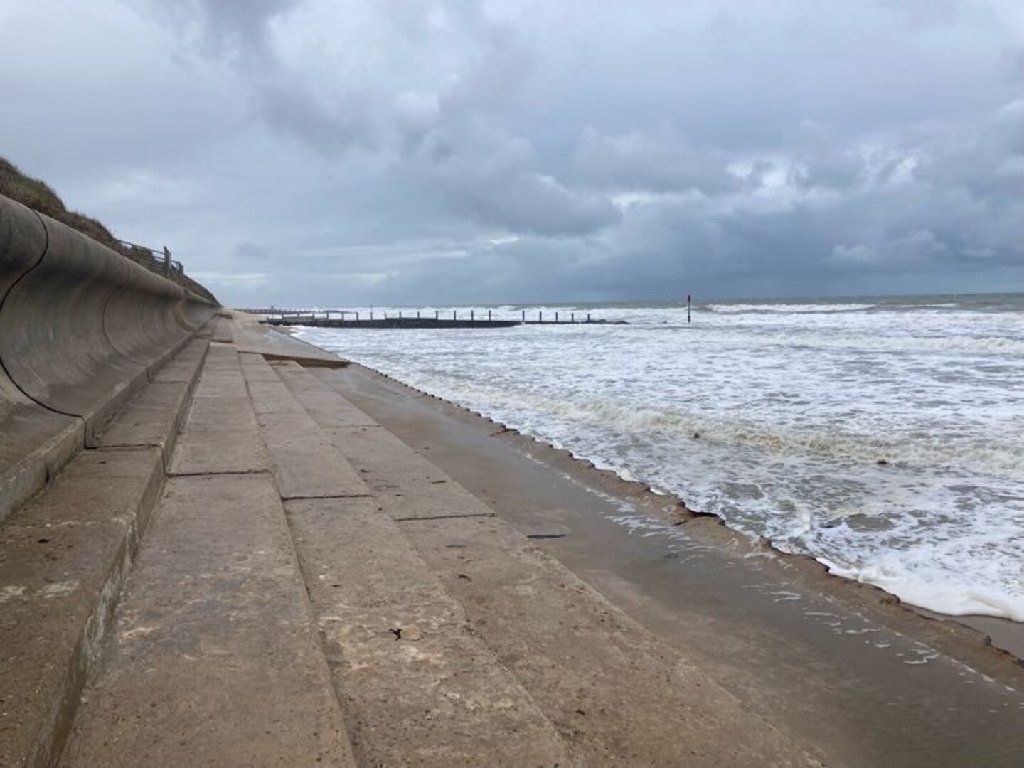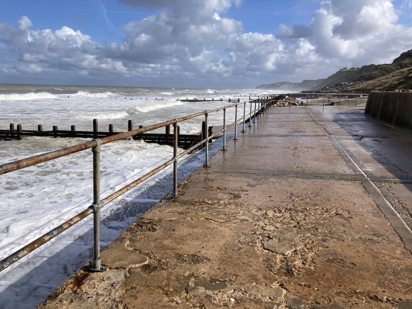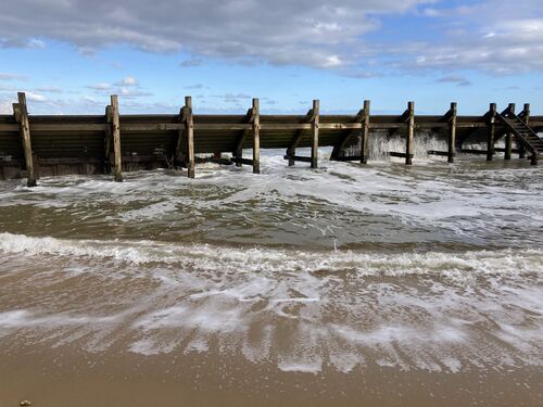 For the final part of the walk I neglected to check the tide times. We were forced to walk behind the sea defences on a narrow piece of beach. It was a little bit scary at times as the sea was crashing heavily against the wooden groynes and threatening to cut us off in places. There is an alternative route, but we needed to catch a bus at the end and found ourselves committed to the beach.