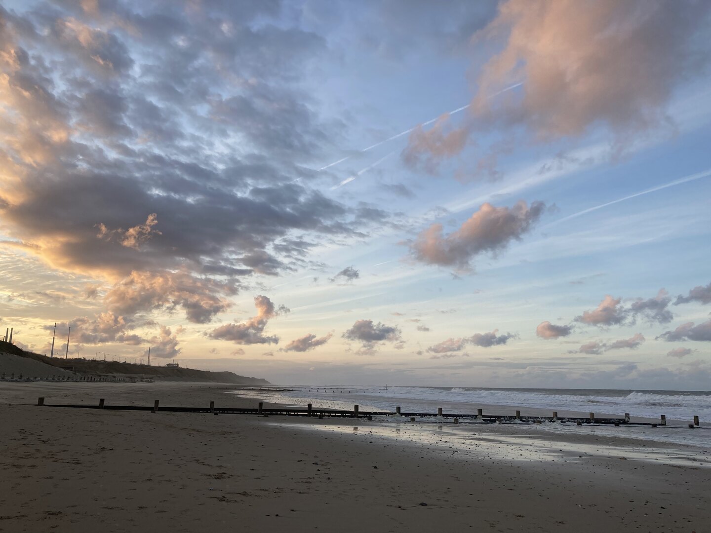 After some easy going cliff top walking we descended on to the beach at Mundesley for the last stretch to Bacton. Due to the gas terminal at Bacton this is one part of the Norfolk coastline that has been protected by extending the beach outwards. Our day ended on the beach here with a sunset creating beautiful colours.